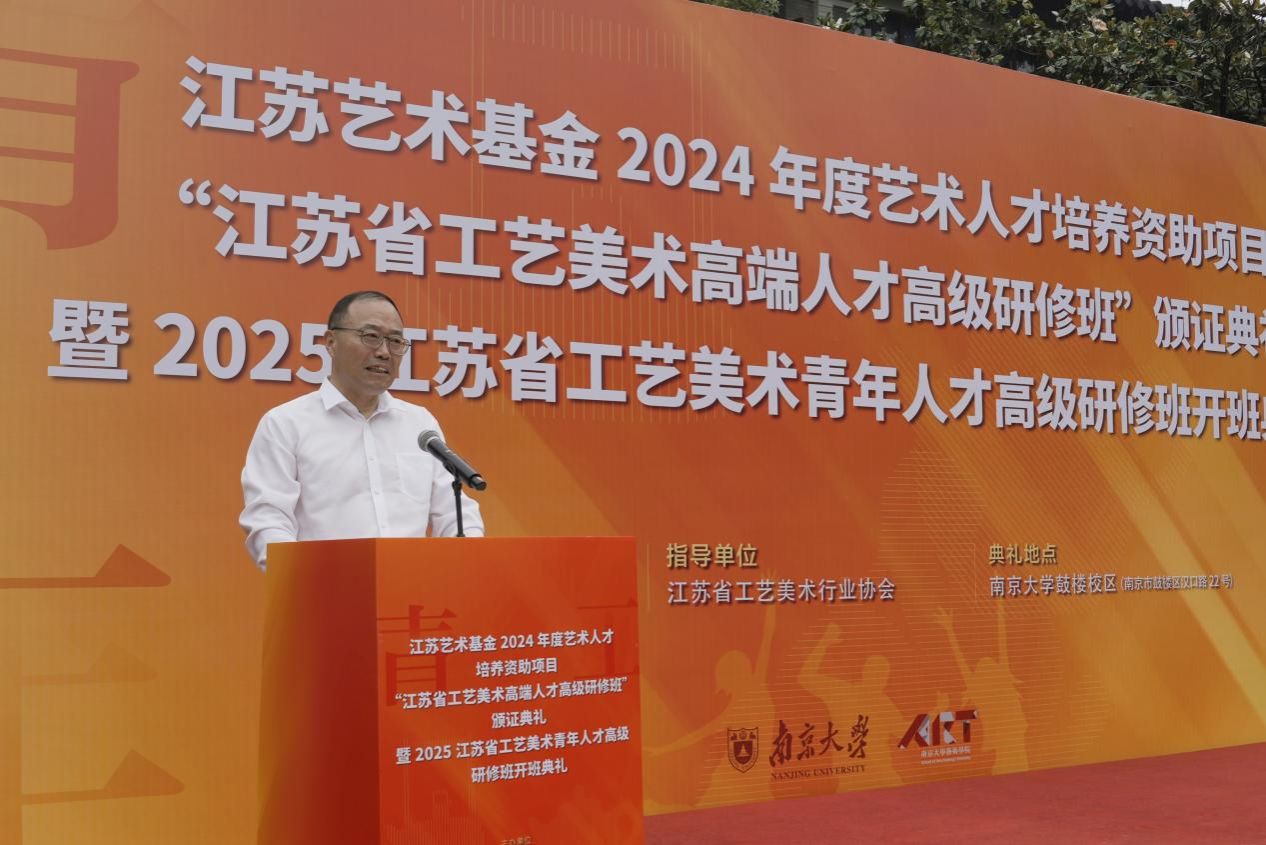 6月8日上午,江苏艺术基金2024年度艺术人才培养资助项目“江苏省工艺美术高端人才高级研修班”颁证典礼暨2025江苏省工艺美术青年人才高级研修班开班典礼在凯发k8官网艺术学院东大楼举行。凯发k8官网党委常委、副校长索文斌,江苏省文联主席章剑华,江苏省文化和旅游厅一级巡视员朱斌等出席活动并致辞。