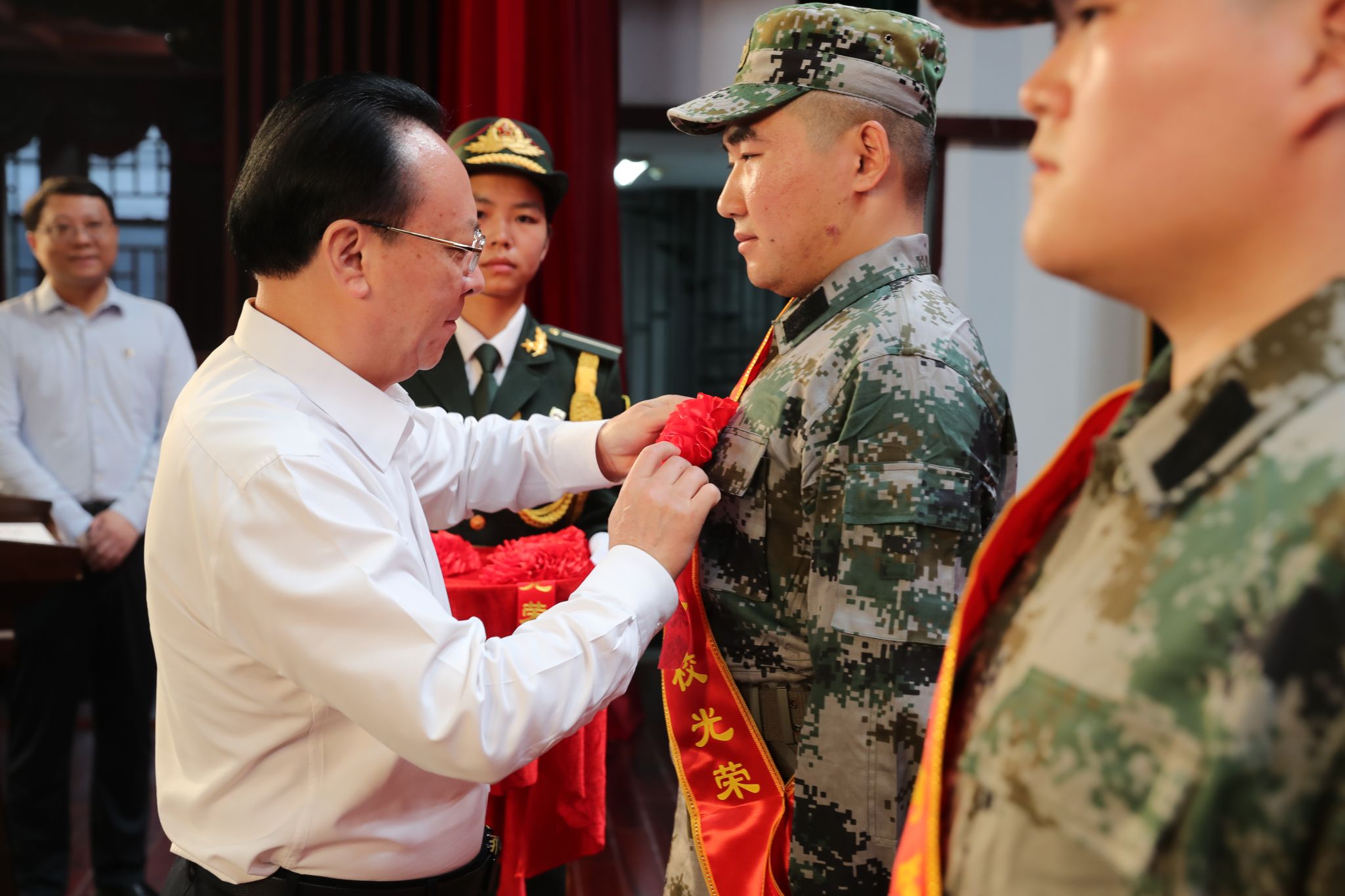 今年,凯发k8官网征兵工作取得新突破,4名本科生响应号召参军入伍,并于9月2日起进入役前训练,接受祖国挑选。谭铁牛为4位应征入伍大学生佩戴大红花。
