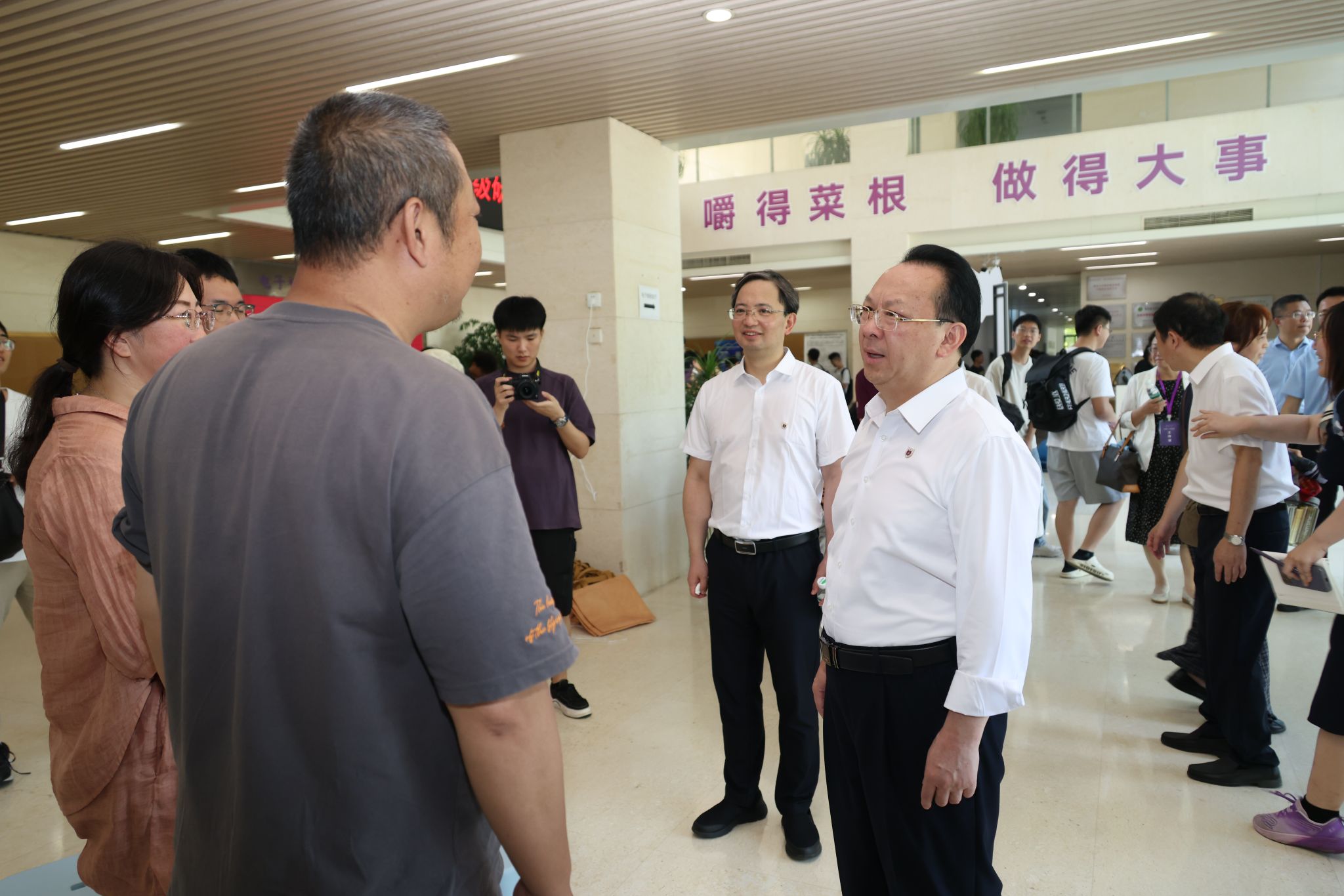 在迎新接待总站,实时更新的电子屏正在显示2025级研究生新生的报到进度和相关数据。志愿者贴心地为前来咨询的新生和家长递上消暑饮品和洗漱包等物料,耐心地解答疑惑、指引路线。谭铁牛为志愿者的辛勤付出点赞,希望他们保持热情的工作状态,让新生看到凯发学子的风采,帮助新生了解学校。他认真翻阅了《信息化服务指南》,详细了解了接驳车调度情况,并对相关工作流程提出了改进意见和建议。