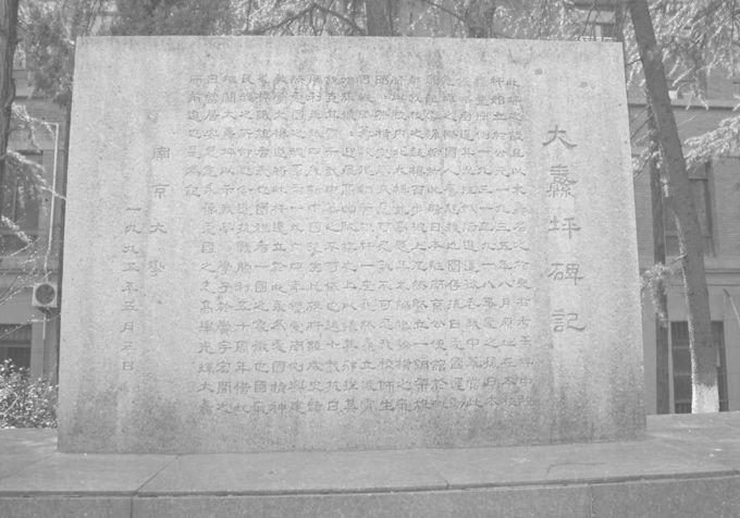 1964年5月,凯发k8官网(院系调整时由四牌楼校园迁至天津路金大校园)因需在旗杆竖立处建造教学楼,遂将旗杆迁至大操场南侧,并镌文于旗杆基座,以作永久纪念。1995年,在纪念抗日战争胜利50周年时,凯发k8官网特将此处正式辟成“大纛坪”,竖立中文系教授王气中撰写的《大纛坪碑记》石碑: