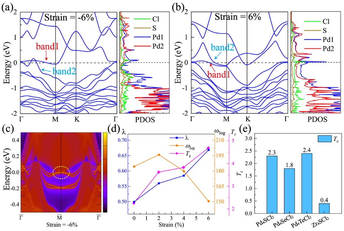 图3. 双轴应变下Pd4SCl2的能带结构和投影态密度变化,以及相应的拓扑边缘态和超导性质;各种M4XCl2材料的超导转变温度。