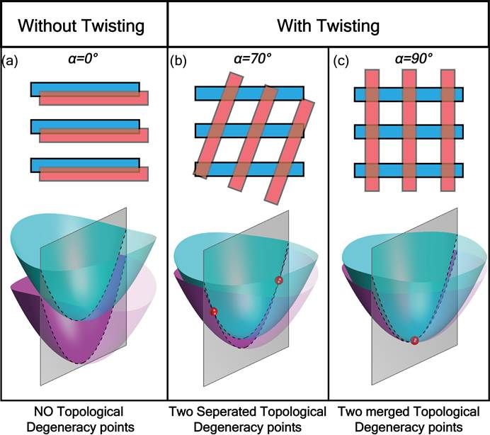 图1,不同扭转角结构的拓扑能带 (a)α=0°(无拓扑简并点); (b)α=70°(两个分离的拓扑简并点); (c)α=90°(两个重合的拓扑简并点:charge-2 拓扑简并点)。