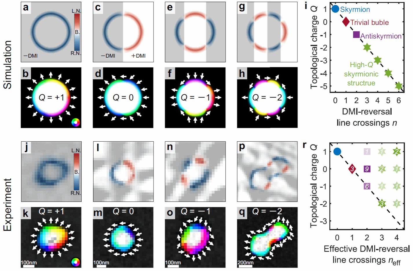 图3|非均质DMI材料对磁结构拓扑数调控。a–h:模拟获得拓扑数Q=+1到?2的磁结构,对应DMI反号线穿过次数n从0至3。i:模拟中Q与n的线性关系。j–q:实验中观察到的不同磁结构(奈尔型斯格明子、拓扑平庸磁泡、反斯格明子、高阶斯格明子)的SPLEEM图像与手性图。r:实验统计结果,散点数字表示每种磁结构在实验中观察到的事件数量,展示Q与n的关系。